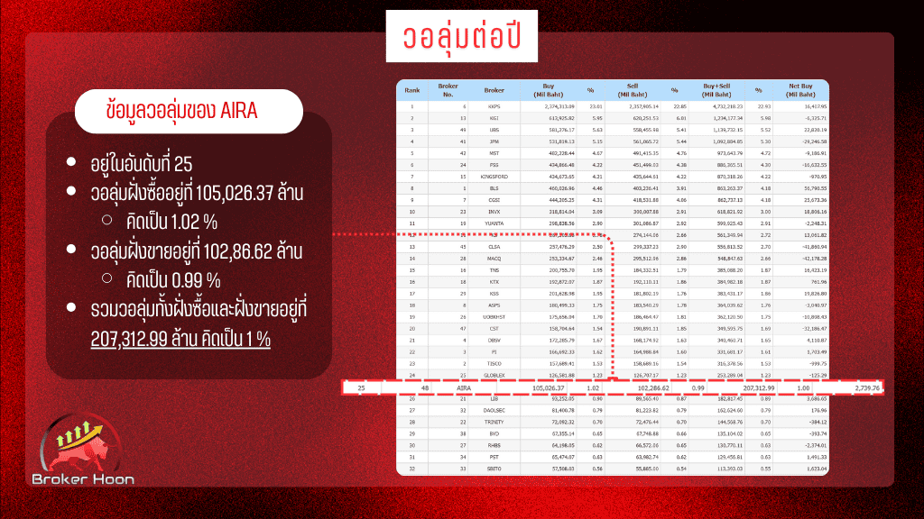 - โบรกเกอร์ AIRA มีการซื้อขายรวมกันทั้งสิ้น 207,312.99 ล้านบาท