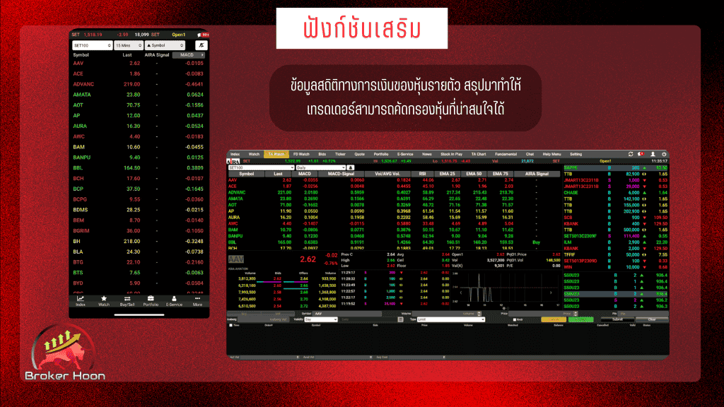 - ฟีเจอร์นี้ตอบโจทย์การลงทุนด้วยการส่งสัญญาณเรียลไทม์และการแสดงข้อมูลที่เข้าใจง่าย ช่วยให้นักลงทุนสามารถวางแผนการซื้อ-ขายได้อย่างมีประสิทธิภาพมากขึ้น