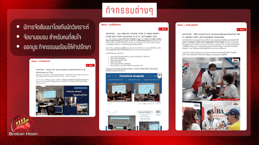 ภาพกิจกรรมต่างๆของทางโบรกเกอร์ AIRA มีการจัดบูธและการจัดสัมมนา เพื่อให้ความรู้แก่คนที่สนใจ