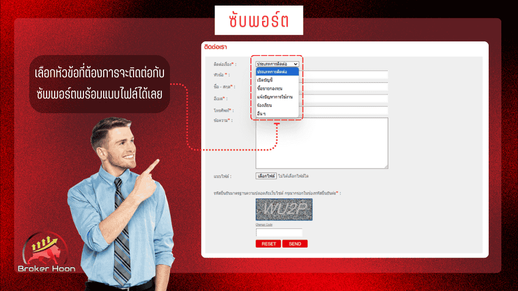 - ประเภทการติดต่อหลากหลาย: มีตัวเลือกชัดเจนและหลากหลาย เช่น เปิดบัญชี, ซื้อขายกองทุน, แจ้งปัญหา, ร้องเรียน ฯลฯ ช่วยให้ผู้ใช้ระบุเรื่องที่ต้องการได้ง่ายขึ้น