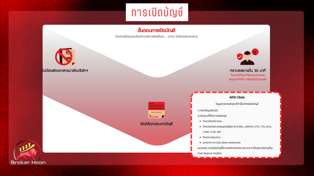 - การเปิดบัญชีกับ AIRA มีช่องทางที่ครบครันและเหมาะกับเทรดเดอร์ทุกกลุ่ม โดยเฉพาะการเปิดบัญชีออนไลน์ที่รวดเร็วและสะดวก จุดเด่นอยู่ที่การใช้ระบบ NDID และการอนุมัติที่รวดเร็ว อย่างไรก็ตาม ควรพัฒนาให้การสมัครผ่านไปรษณีย์เหมาะสมกับยุคดิจิทัลมากยิ่งขึ้น