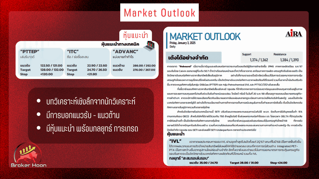 - “มีบทวิเคราะห์เชิงลึกมากมาย” เจาะลึกแนวรับ-แนวต้าน หุ้นเด่นรายวัน พร้อมกลยุทธ์การลงทุน