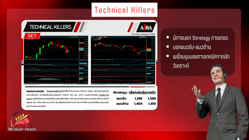 - Technical Killers: มุมมองทางเทคนิคมีการวิเคราะห์ภาพรายสัปดาห์และภาพรายวันให้กับเทรดเดอร์ บอกแนวรับแนวต้านให้เทรดเดอร์สามารถเห็นภาพได้มี Strategy บอกยกตัวอย่างเช่น แนะนำให้ถือ, ย่อซื้อ, เก็งกำไรระยะสั้น หรือ Scalping เป็นต้น ด้วย Strategy เหล่านี้จะช่วยทำให้เทรดเดอร์มั่นใจและได้ความรู้เพิ่มมากขึ้น